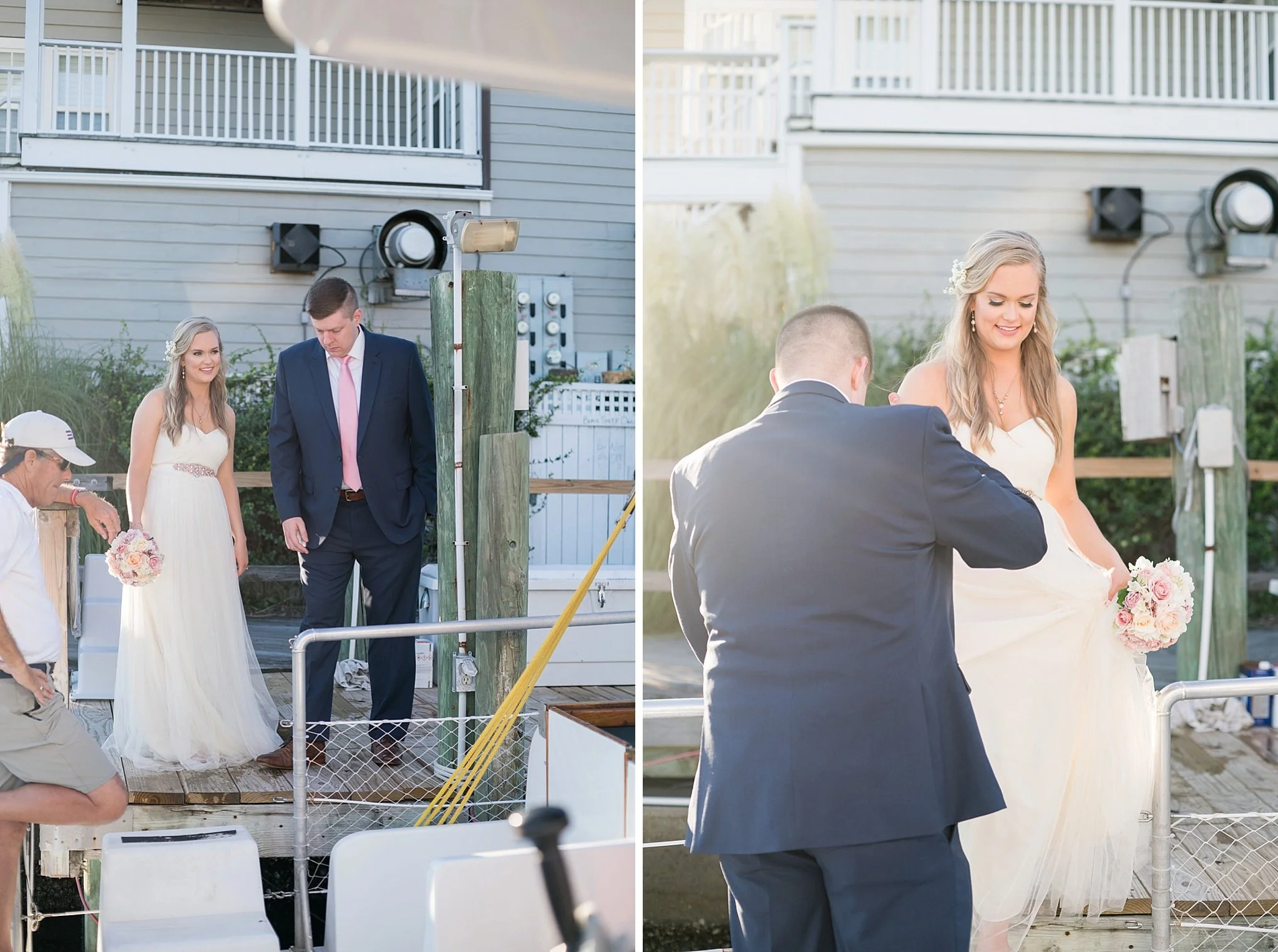 Invite me out on a boat, I’m going to say yes. Invite me out on a boat to participate in a wedding, I’m going to say heck yes! From the beginning, that’s exactly how I felt about Jaclyn and David’s intimate Beaufort, NC wedding day. We had been counting down to their big day for what seemed like forever and literally would tell anyone that would listen about how amazing we thought the experience was going to be. Ya’ll… It was even better than anything out of my wildest imagination. From the moment we arrived, we immediately felt like we had known Jaclyn and David for our entire lives. They were surrounded by 13 of their closest family members throughout the day and the joy and happiness that everyone felt was so apparent. Following their first look, everyone enjoyed a delicious dinner before setting sail for a sunset cruise and ceremony. Every single thing about Jaclyn and David’s wedding day was absolutely perfect and I hope these preview photos captured their love for each other.